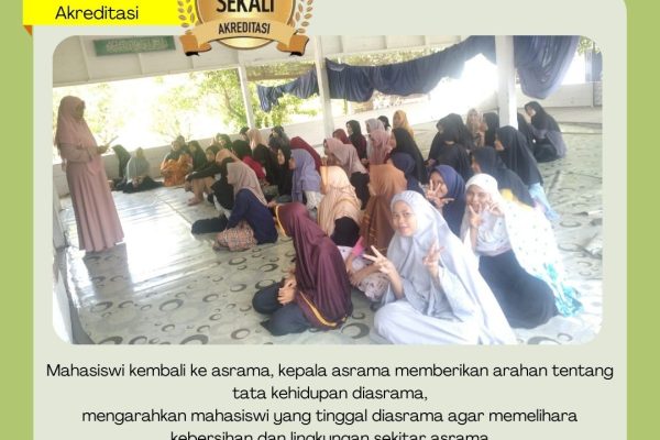 Jum’at, 6 Oktober 2023 Mahasiswi kembali ke asrama, kepala asrama memberikan arahan tentang tata kehidupan diasrama, mengarahkan mahasiswi yang tinggal diasrama agar memelihara kebersihan dan lingkungan sekitar asrama. Kepala asrama meghimbau seluruh mahasiswa yg yg tinggal diasrama untuk gotong royong pada hari minggu agar tercipta asrama dan lingkungan yang bersih dan rapi. dan mengajak mahasiswa…