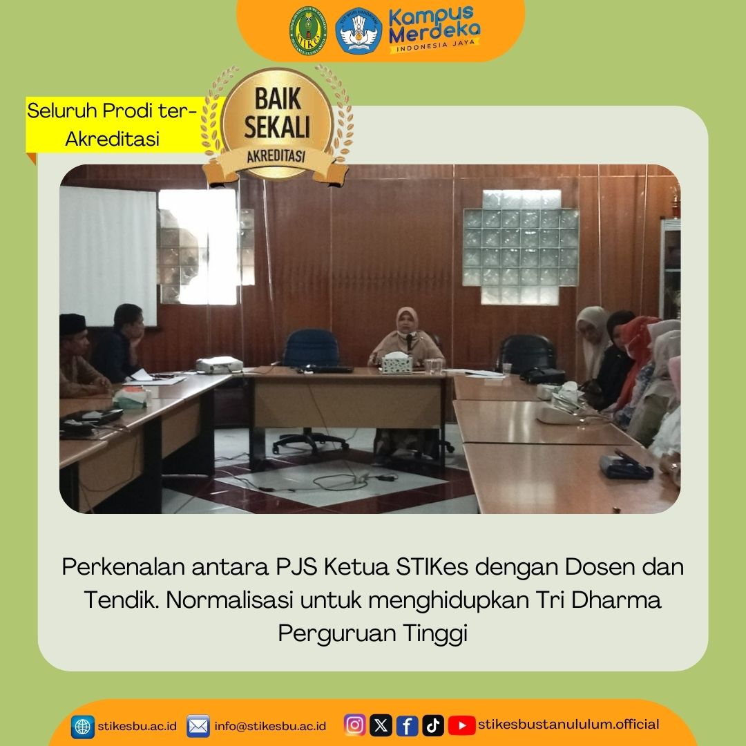 Perkenalan antara Pjs. Ketua STIKes dengan Dosen dan Tendik. Penyampaian Rencana Normalisasi untuk menghidupkan Tri Dharma Perguruan Tinggi. Mendata kembali Dosen dan Tendik yang masih bersedia bergabung kembali dengan STIKes Bustanul Ulum Langsa.