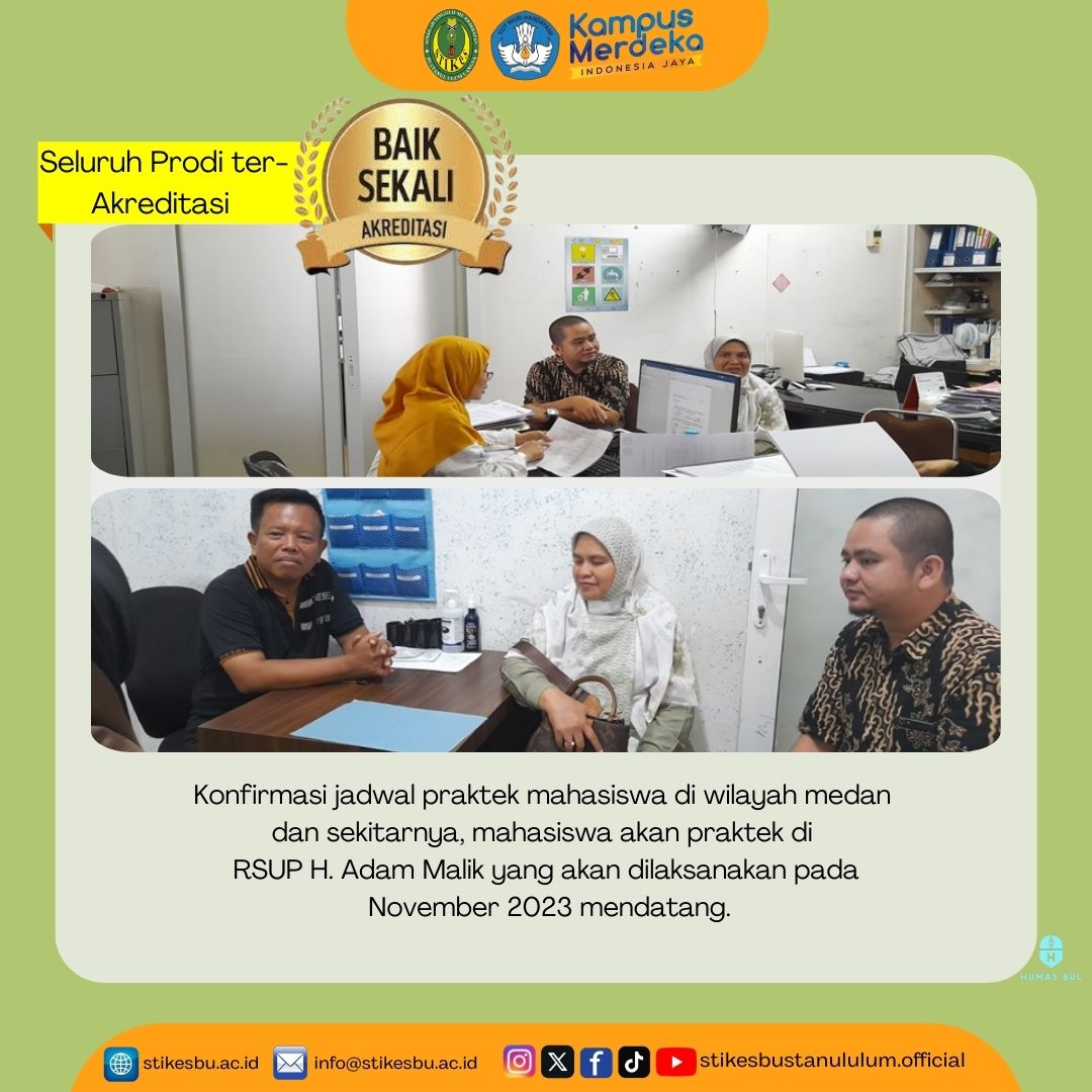 BeritaKONFIRMASI JADWAL PRAKTEK MAHASISWA admin1 tahun ago01 mins Rabu, 18 Oktober 2023 Konfirmasi jadwal praktek mahasiswa di wilayah medan dan sekitarnya, mahasiswa akan praktek di RSUP H. Adam Malik yang akan dilaksanakan pada November 2023 mendatang. Navigasi pos Previous: GOTONG ROYONG MEMBERSIHKAN LABORATORIUMNext: PRAKTEK LABORATORIUM MANDIRI Tinggalkan Balasan Batalkan balasanAlamat email Anda tidak akan dipublikasikan. Ruas yang wajib ditandai *Komentar * Nama * Email * Situs Web Simpan nama, email, dan situs web saya pada peramban ini untuk komentar saya berikutnya.