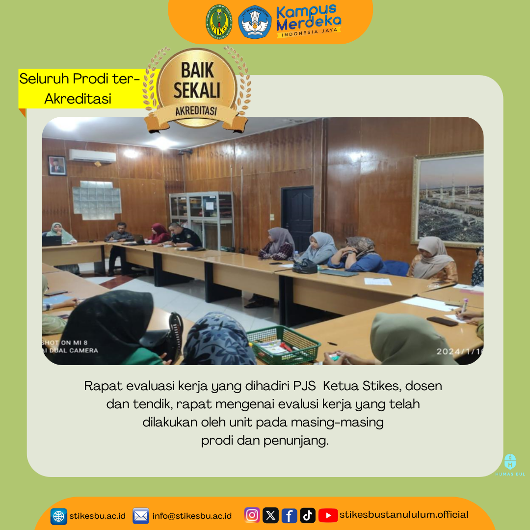 Rapat evaluasi kerja yang dihadiri PJS Ketua Stikes, dosen dan tendik, rapat mengenai evalusi kerja yang telah dilakukan oleh unit pada masing-masing prodi dan penunjang.