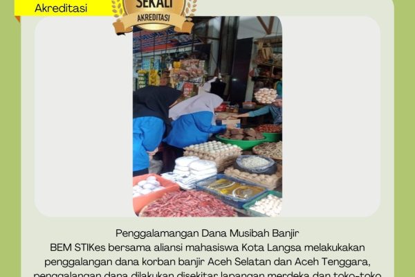 Selasa, 28 November 2023 BEM STIKes bersama aliansi mahasiswa Kota Langsa melakukakan penggalangan dana korban banjir Aceh Selatan dan Aceh Tenggara, penggalangan dana dilakukan disekitar lapangan merdeka dan toko-toko seputar kota Langsa.