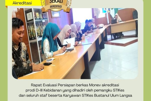 Rapat Evaluasi Persiapan berkas Monev akreditasi prodi D-III Kebidanan yang dihadiri oleh pemangku STIKes dan seluruh staf beserta Karyawan STIKes Bustanul Ulum Langsa